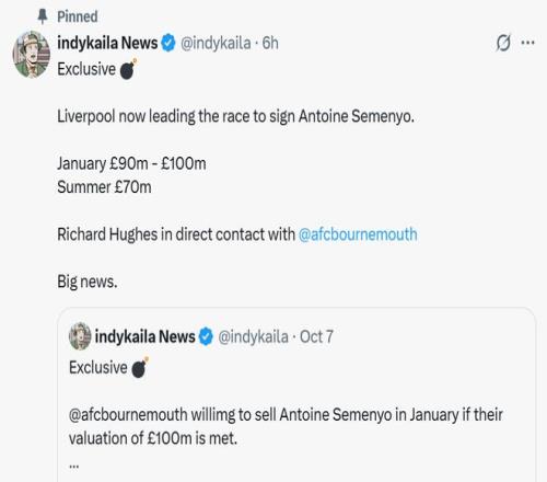 博主indykaila News此前就报道表示,如果收到符合心意的报价,伯恩茅斯有可能选择在冬窗出售塞梅尼奥。而今他对此进行跟进报道,表示利物浦正在这场争夺战中处于领先位置,如果在冬窗出手,预计转会费在9000万-1亿英镑之间,而若等到明年夏天,则有可能降到7000万英镑。