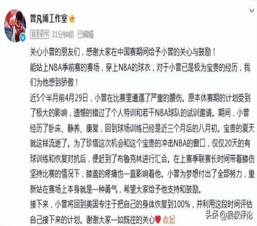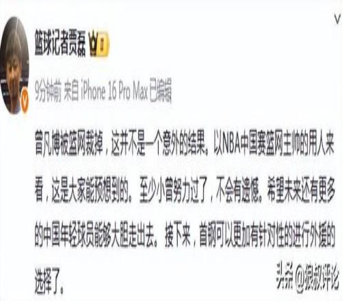 篮球记者贾磊发文点评:曾凡博被篮网裁掉,这并不是一个意外的结果。以NBA中国赛篮网主帅的用人来看,这是大家能预想到的。 至少小曾努力过了,不会有遗憾。