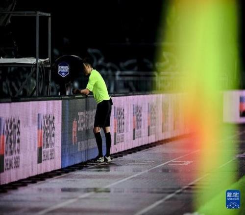 10月18日,主裁判孟祥昆在比赛中观看VAR(视频助理裁判)回放,并在观看后判罚给山东泰山队一粒点球。新华社记者 江汉 摄