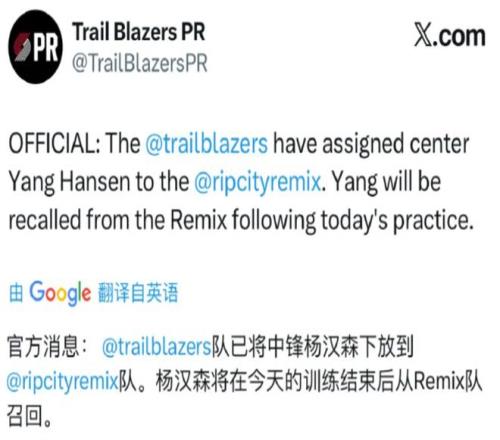 NBA方面在今天传来了一个消息:波特兰开拓者队再次决定将杨瀚森下放到NBA发展联盟的撕裂之城混音队参加合练,并且会在今天的训练结束之后将其召回。