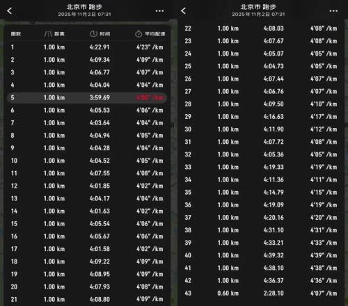 跟他跑了500米后,我自己真不行了,当时配速掉到419-420。37公里后,北马最大的一个爬升出现了。在奥林东桥上桥时,我彻底废了——如果没这段爬升,也许最多掉到430左右 ,最后以2575几完赛,但我彻底崩在了这里。崩完后,我用438-439顺了两公里。