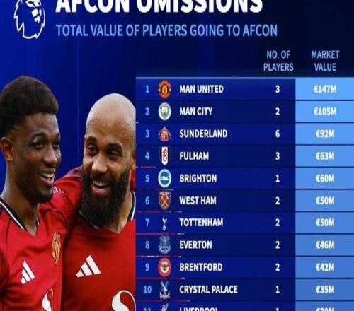北京时间12月17日,在2025年非洲杯本周末就将打响的情况下,德转列出了英超20支球队非洲杯参赛球员的总身价榜,曼联3人参赛总身价1.47亿欧元排名第一,曼城2人参赛1.05亿欧元第二。